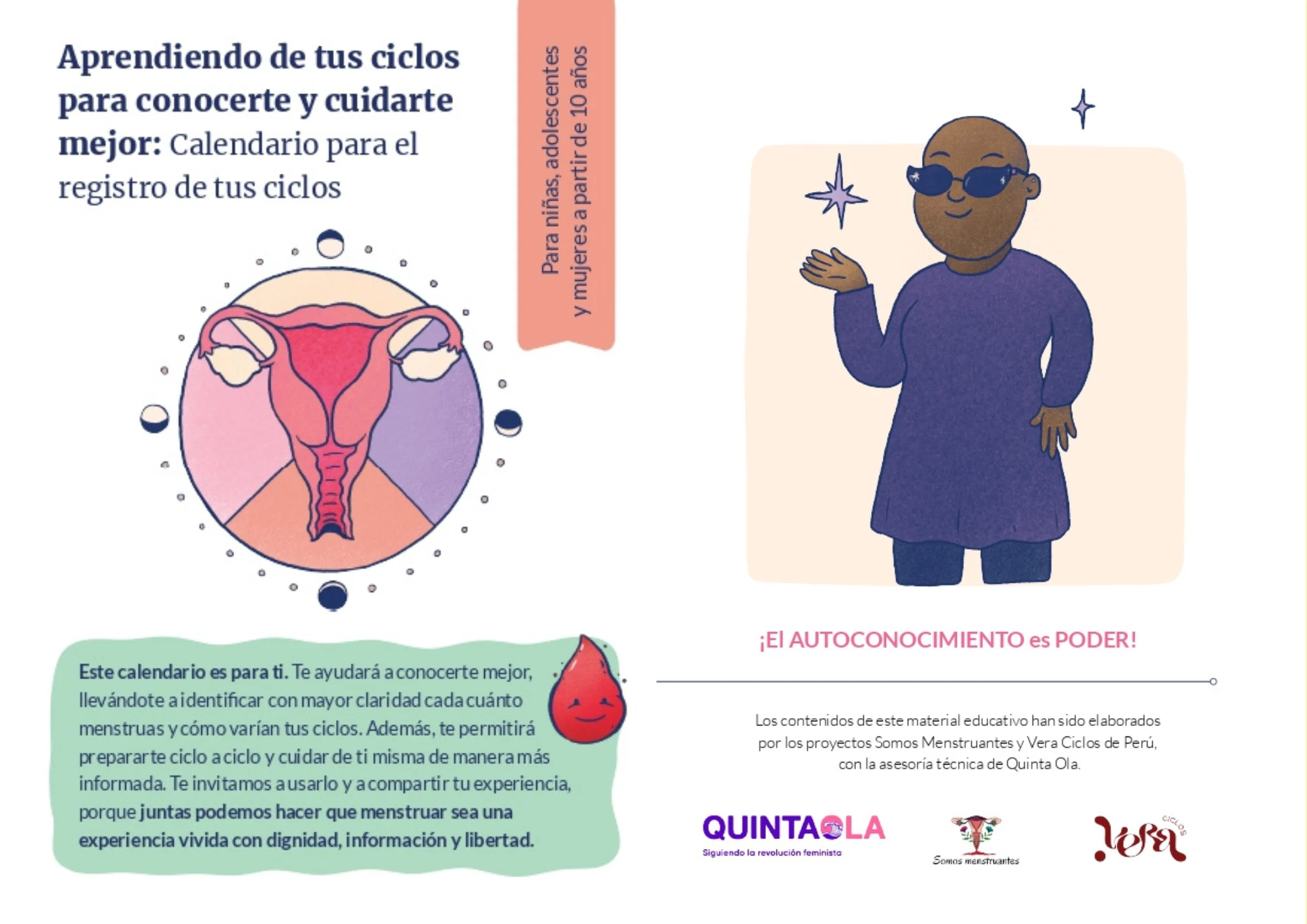 Quinta Ola, en colaboración con Somos Menstruantes y Vera Ciclos, hemos elaborado este calendario menstrual dirigido a niñas, adolescentes y mujeres a partir de 10 años, que las ayudará a conocerce mejor e identificar con mayor claridad cada cuánto menstrúan y cómo varían sus ciclos. Les invitamos a usarlo y compartir su experiencia porque juntas podemos hacer que menstruar sea una experiencia vivida con dignidad, información y libertad.